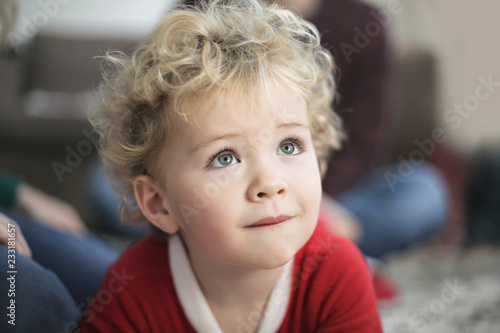 Portrait Of Cute Young Boy With Blue Eyes And Curly Blonde Hair