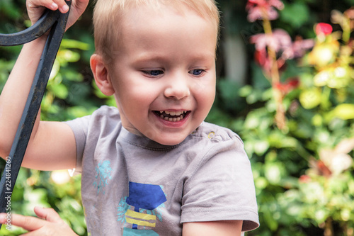 Cute Baby Boy Smiling Outdoor Ot Green Flowers Background Stock