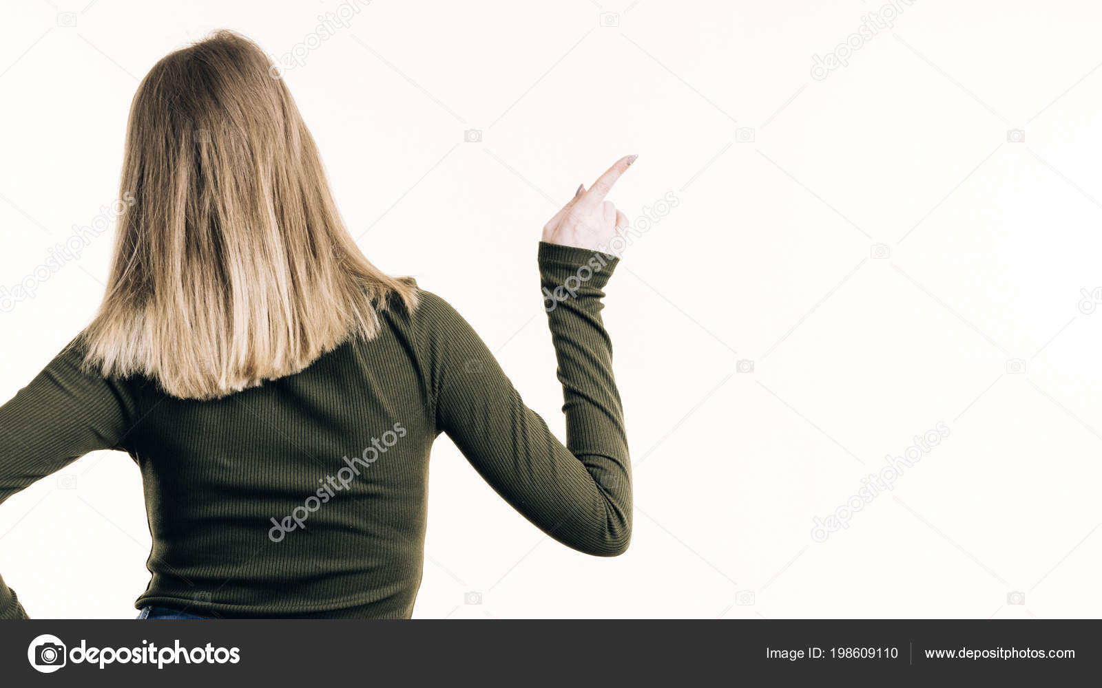 Back View Woman Blonde Hair White Background Showing Peace Good
