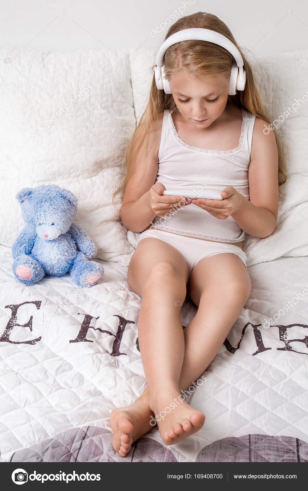 Beautiful Little Girl Sitting On Bed Stock Photo Edit Now 1417599824