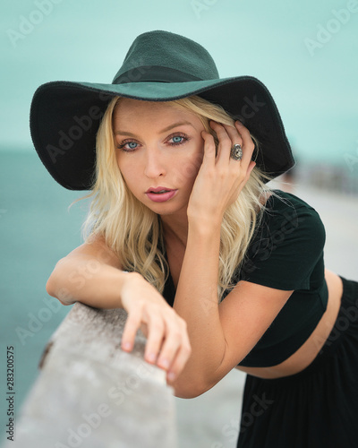 Beautiful Blonde Girl With Big Blue Eyes And Black Dress Looking