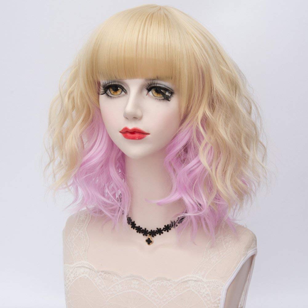 Bob Wig Oblique Fringe Bangs Short Wavy Wigs Pink Purple Blonde