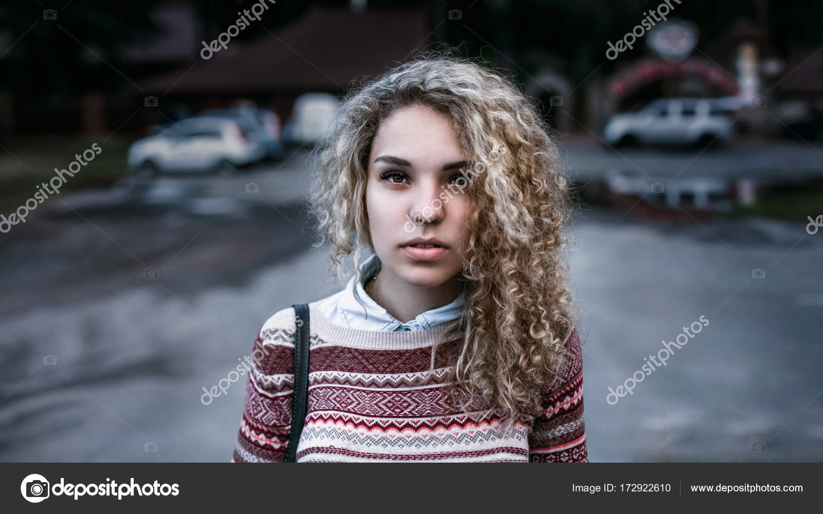 Cute Girl Blonde With Curly Hair Brown Eyes Wearing A Sweater