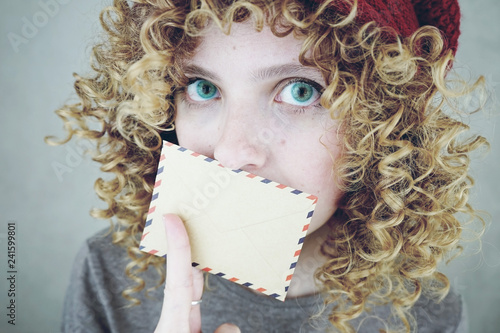 Beautiful young girl with long curly blond hair and blue eyes looks herself before makeup.