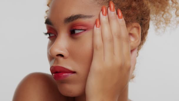 Mixed Race Black Woman With Blonde Curly Hair Wears Red Eyeshadows