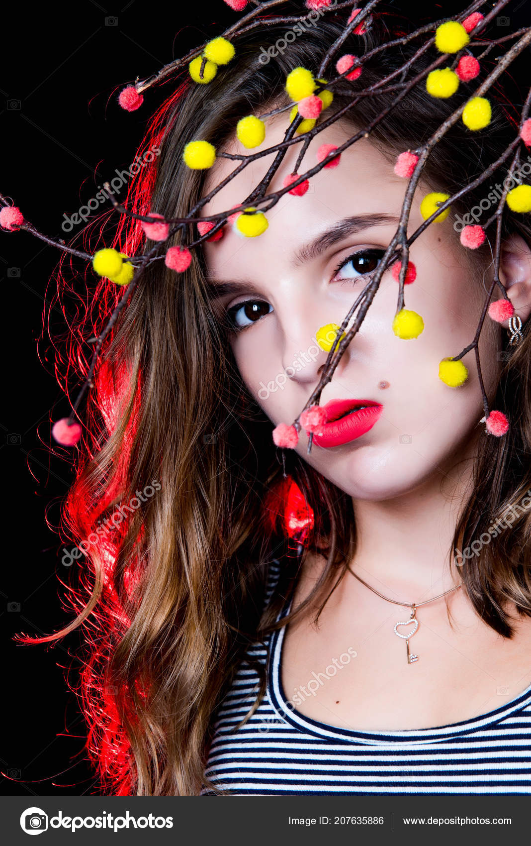 Laughing Teen Girl With Long Blonde And Pink Hair Is Wearing A