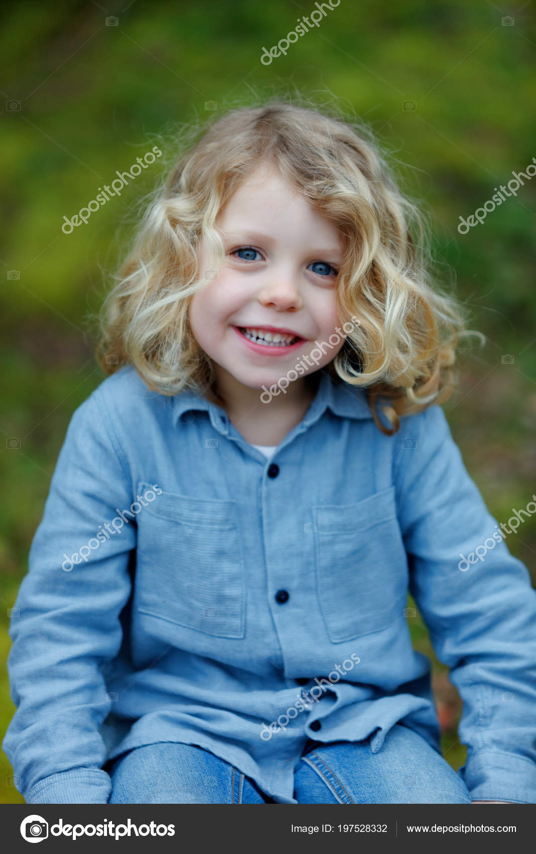 Little Boy With Pretty Cute Face Brown Eyes And Blond Curly Long