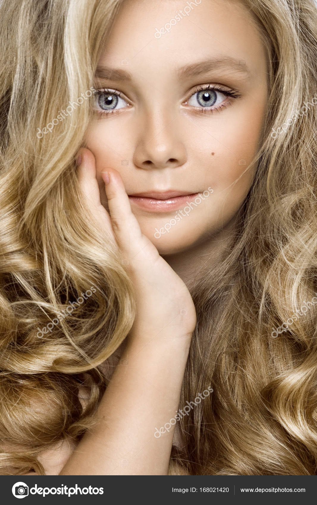 Cute Girl Eleven Years Old With Blond Long Hair On White